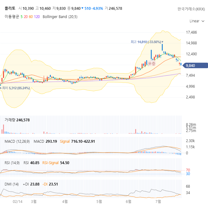 | 현재 주가 (7/21) | 9,840원 | 단기 고점 대비 약 -33% 조정 |