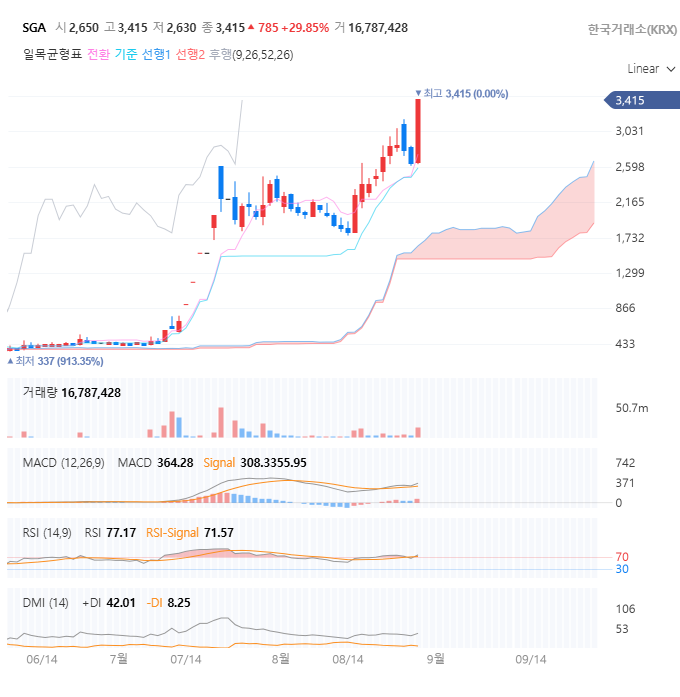 차트라고 부르기 민망할 정도의 '수직 상승'을 보여주고 있습니다. 오늘 상한가로 마감하며 52주 신고가를 경신, 위에는 아무런 매물대가 없는 상태입니다. '하늘이 열렸다'고 표현할 수 있죠. 폭발적인 거래량은 시장의 모든 자금이 SGA로 쏠리고 있음을 증명하며, MACD와 DMI 등 모든 기술적 지표가 역사적인 수준의 강세 신호를 보내고 있습니다.