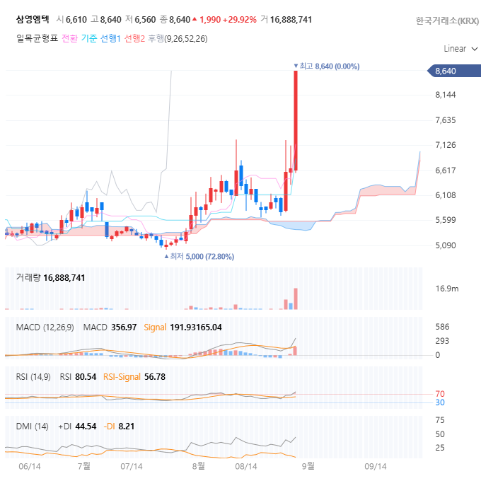 "자, 이제 가장 궁금해하실 차트를 볼 시간입니다. 차트는 그야말로 '폭발'이라는 단어 외에는 설명이 어렵네요. 첫째, 이전 고점을 가볍게 돌파하는 거대한 장대양봉이 출현했습니다. 둘째, 더 중요한 것은 바로 거래량입니다. 평소와는 비교도 안 될 만큼(1,688만 주) 터지면서 상승했다는 것은, 시장의 모든 관심이 집중된 강력한 매수세가 유입되었다는 명백한 증거입니다. 셋째, MACD와 DMI 같은 보조지표들도 모두 강력한 상승 추세가 시작되었음을 가리키고 있습니다. 차트가 '나 이제 갈 거야!'라고 외치는 듯합니다."