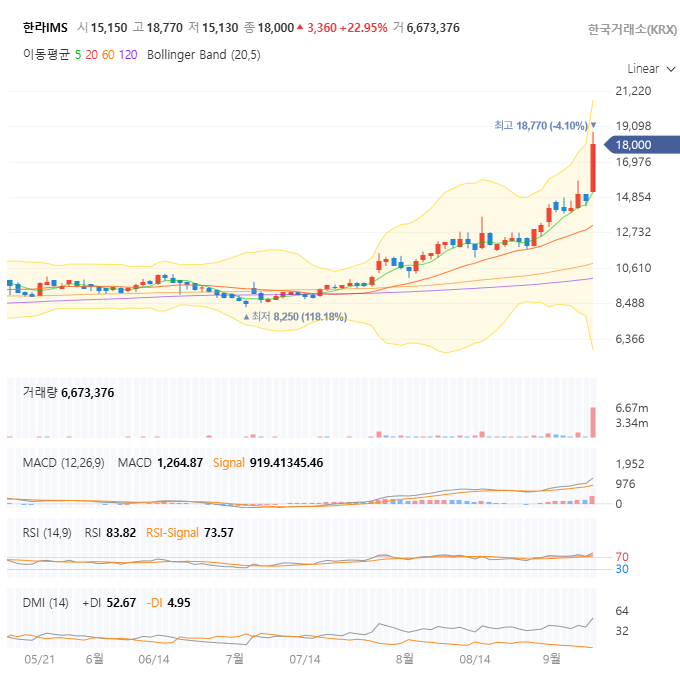안녕하세요, 주식탐구생활의 바리스탁입니다! "역시 K-조선!"이라는 말이 절로 나오는 요즘입니다. 연일 들려오는 수주 낭보에 조선업 전체가 활기를 띠고 있는데요. 이런 분위기 속에서 오늘 무려 22% 넘게 급등하며 시장의 스포트라이트를 받은 종목이 있습니다. 바로 **한라IMS**입니다! 최근 무서운 상승세로 '이거 지금이라도 타야 하나?' 고민하는 분들 많으실 텐데요. 그래서 오늘은 한라IMS가 과연 조선업 슈퍼사이클의 파도를 제대로 탈 만한 튼튼한 배인지, 그리고 뜨거워진 차트는 우리에게 어떤 신호를 보내고 있는지 함께 꼼꼼히 분석해보겠습니다! 😊