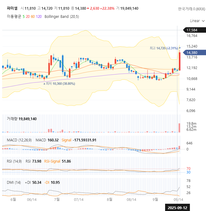 | 현재 주가 (25.09.15 종가) | 14,380원 | 전일 대비 +22.38% 폭등 |