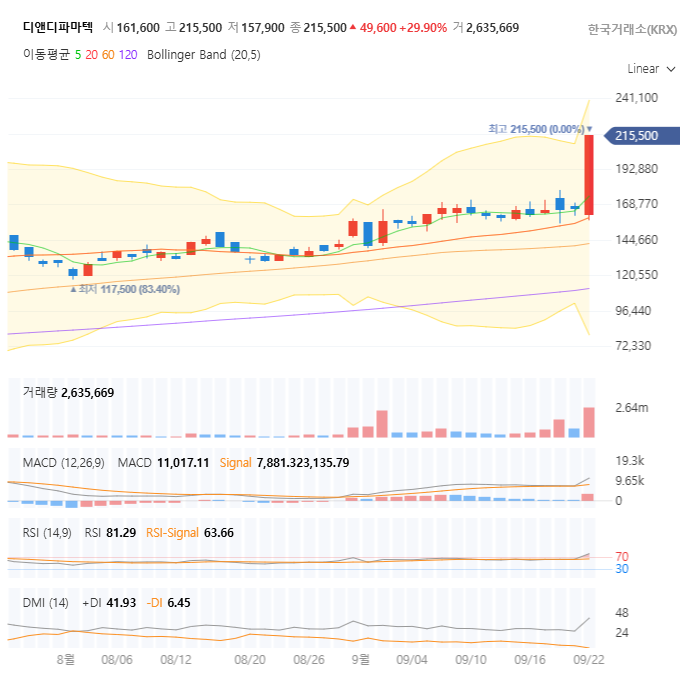 | 현재 주가 (종가) | 215,500원 | 상한가 | 역사적 신고가 |