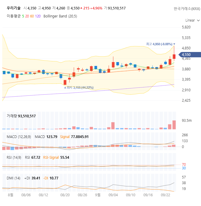 "차트는 '이제 시작'이라고 외치는 듯합니다. 첫째, 9,350만 주라는 엄청난 거래량이 터지면서 장기 횡보하던 박스권을 강력하게 돌파했습니다. 이는 시장의 모든 관심이 우리기술로 쏠리고 있다는 명백한 증거입니다. 둘째, 모든 이동평균선이 정배열 초기 국면으로 진입하고 있으며, MACD 지표 역시 골든크로스를 만들며 상승 에너지가 폭발하고 있음을 보여줍니다. DMI 지표 또한 +DI가 -DI를 압도하며 강력한 상승 추세가 시작되었음을 확인시켜 줍니다."