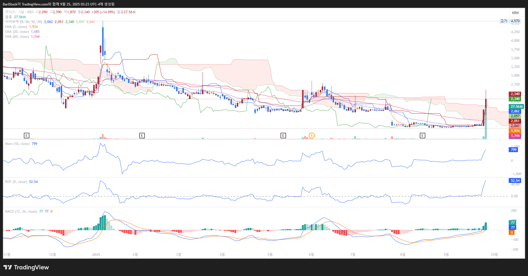 - 진입 시점: 지금 바로 매수하기보다는, 주가가 구름대 상단인 2,340원을 거래량을 동반하여 확실히 돌파하고 그 위에서 안착하는 것을 확인한 뒤에 진입해도 늦지 않습니다.