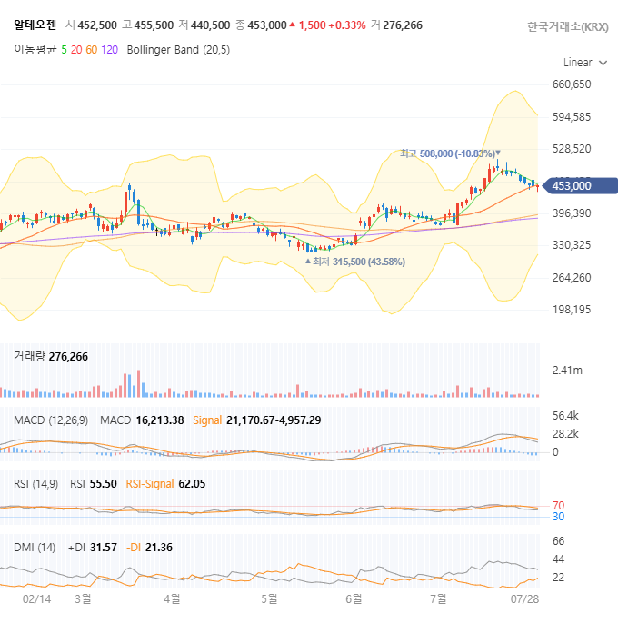 | 현재 주가 (07/28) | 453,000 원 | 조정 후 반등 시도 구간 |
