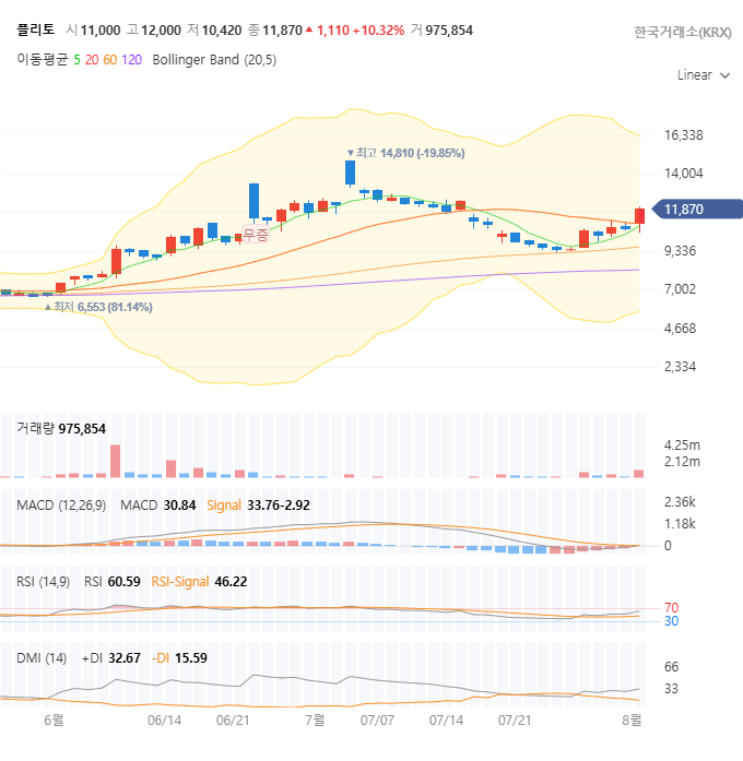 | 현재 주가 (25/08/01) | 11,870원 | 단기 이평선 돌파, 장기 이평선 아래 위치 |