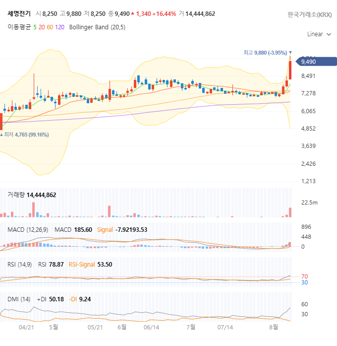 펀더멘탈이 기업의 '체력'이라면, 차트는 기업을 둘러싼 투자자들의 '심리'를 보여줍니다. 과연 세명전기의 차트는 우리에게 어떤 이야기를 들려주고 있을까요?