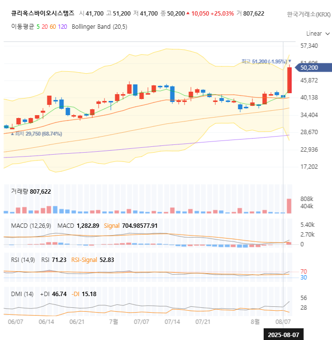 | 현재 주가 (25/08/08) | 50,200 원 | 25.03% 폭등 마감 |