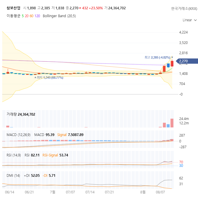 자, 이제 가장 궁금해하실 차트를 볼 시간입니다. 삼보산업의 일봉 차트를 살펴보면 최근 주가 변동성이 매우 크다는 것을 한눈에 알 수 있습니다. 2025년 8월 초, 큰 거래량을 동반하며 주가가 2,385원까지 급등했지만, 다음 날 바로 하락하며 현재 1,838원 부근에서 마감하는 등 등락을 반복하고 있습니다.