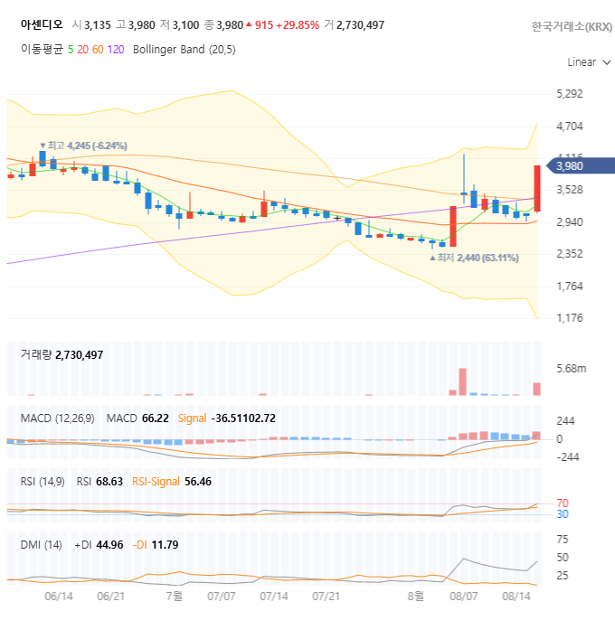 | 현재 주가 (25.08.19 종가) | 3,980원 | 전일 대비 +29.85% 급등 |